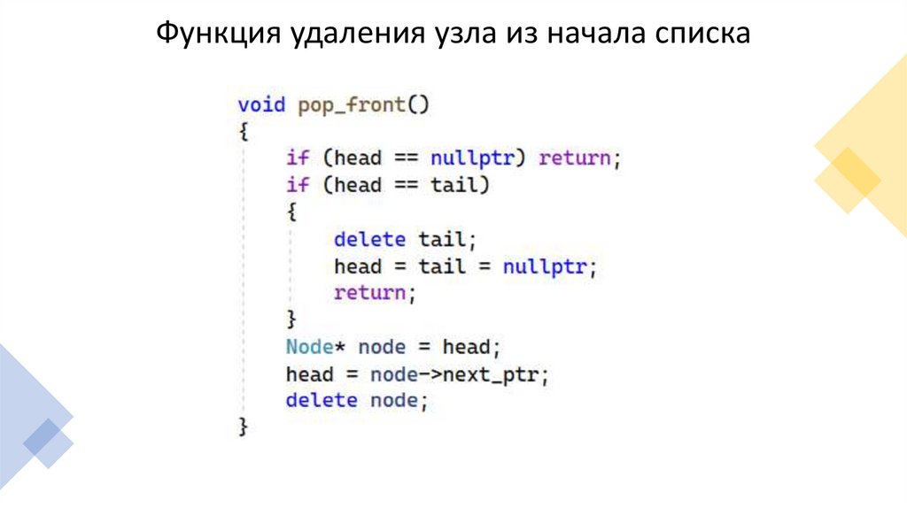 Функция удаления узла из начала списка13.