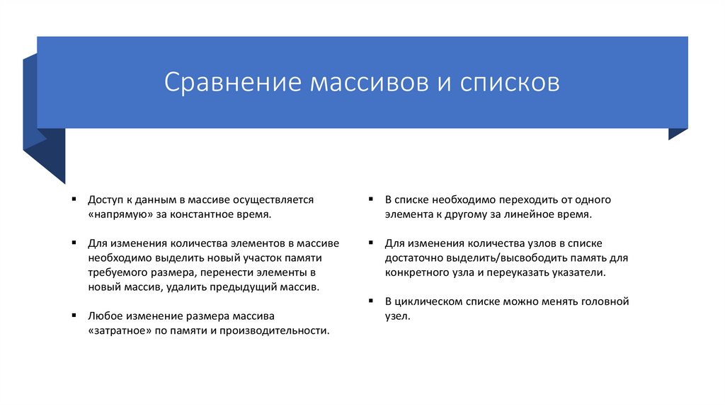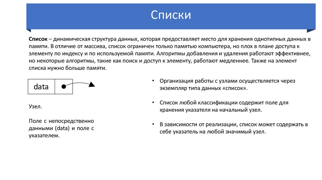 памяти. В отличие от массива, список ограничен только памятью компьютера, но плох в плане доступа к