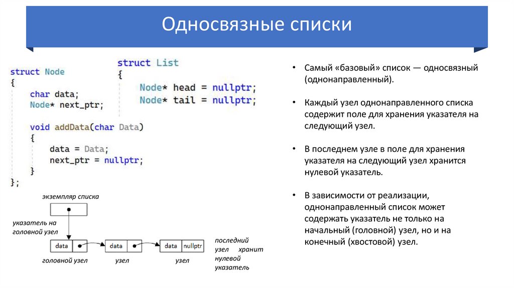 • Каждый узел однонаправленного списка
