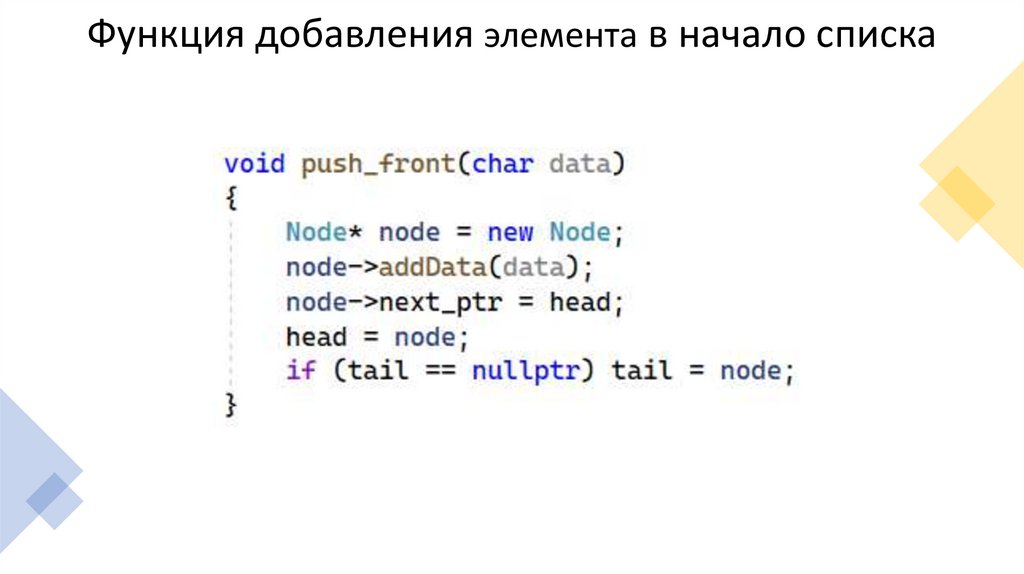 Функция добавления элемента в начало списка10.
