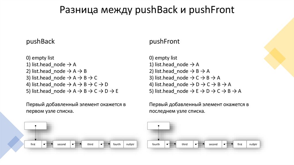 Разница между pushBack и pushFrontpushBack