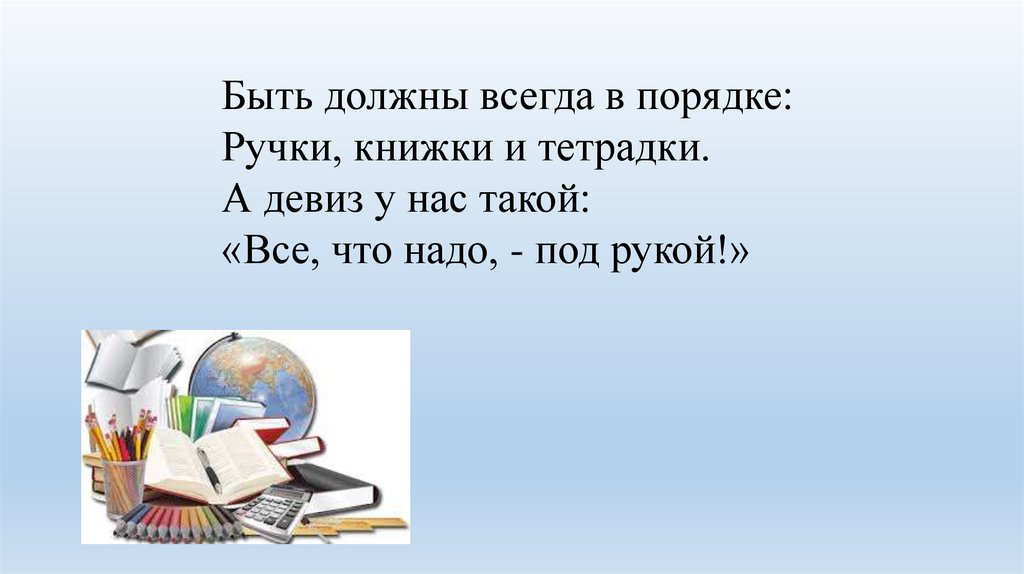 Быть должны всегда в порядке:Ручки, книжки и тетрадки.