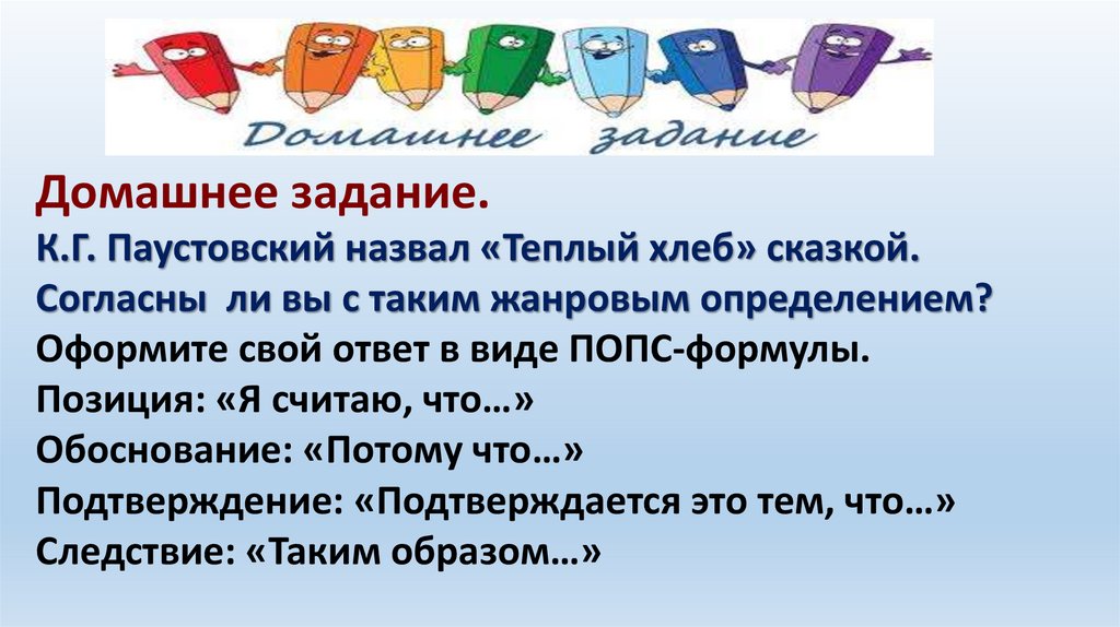 Домашнее задание.К.Г. Паустовский назвал «Теплый хлеб» сказкой.