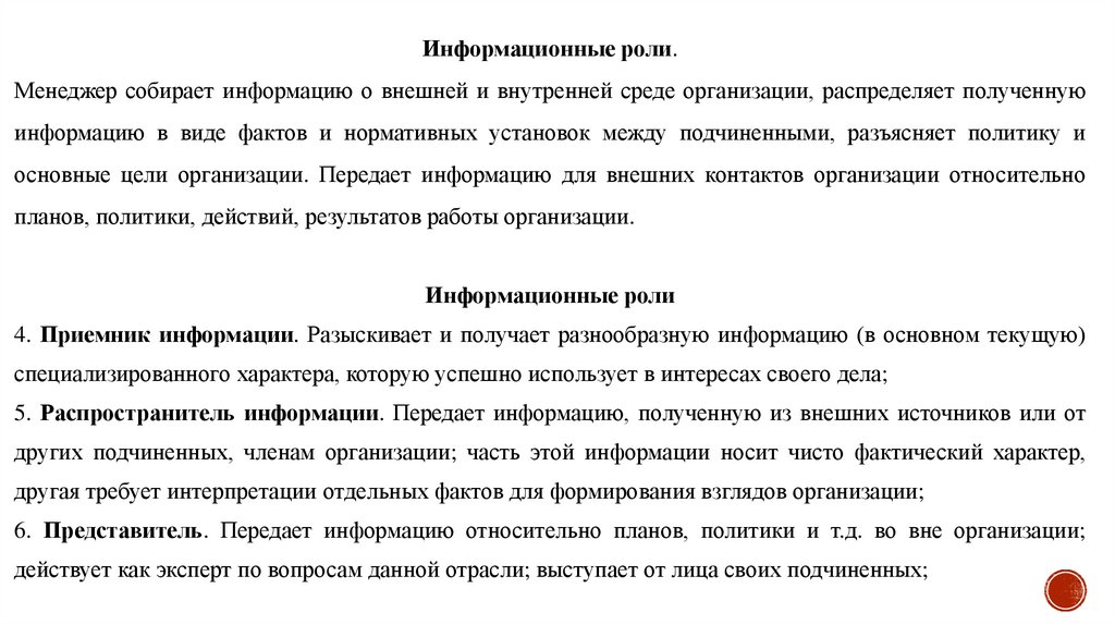 Передает информацию относительно планов, политики Участие в заседаниях, общение через почту, устные