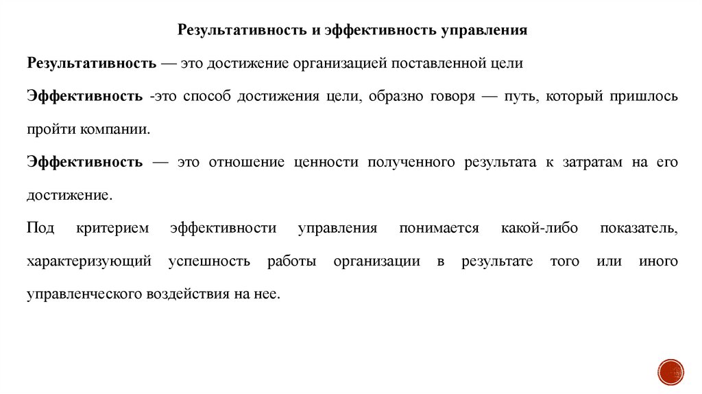Результативность и эффективность управленияРезультативность — это достижение организацией поставленной цели