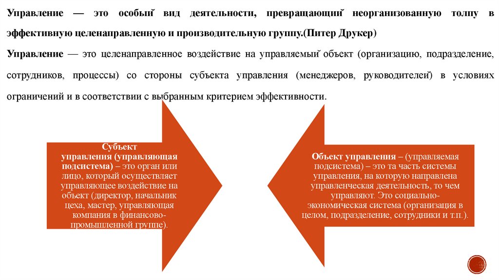 Управление — это особый вид деятельности, превращающий неорганизованную толпу вэффективную целенаправленную и производительную группу.(Питер Друкер)