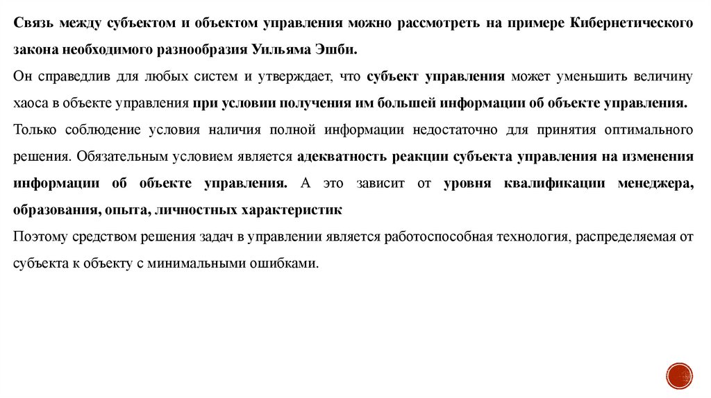 Он справедлив для любых систем и утверждает, что субъект управления может уменьшить величину