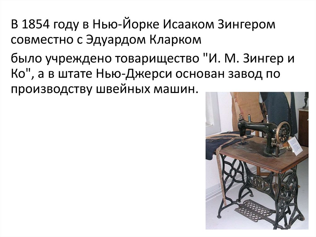 В 1854 году в Нью-Йорке Исааком Зингеромсовместно с Эдуардом Кларком