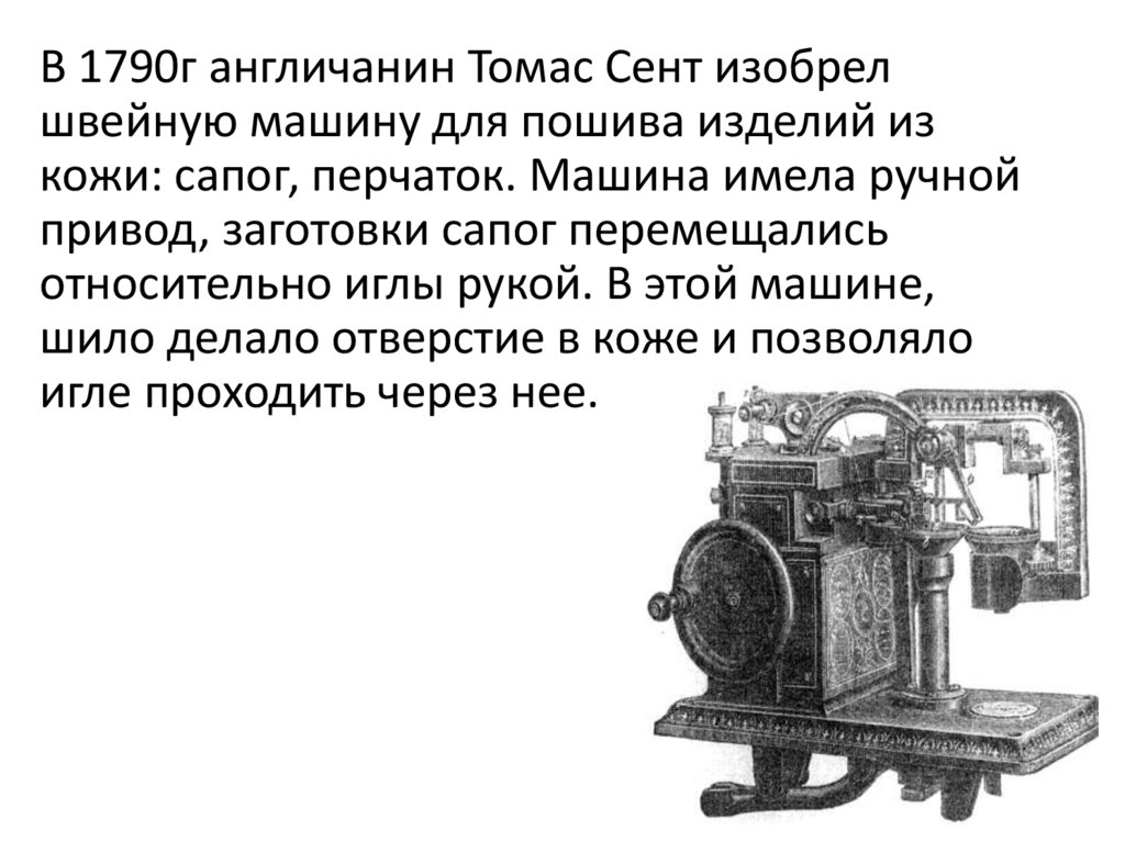 В 1790г англичанин Томас Сент изобрелшвейную машину для пошива изделий из