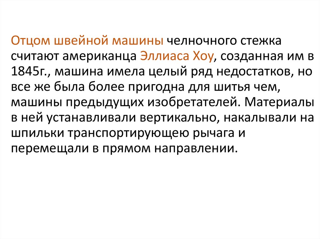 Отцом швейной машины челночного стежкасчитают американца Эллиаса Хоу, созданная им в