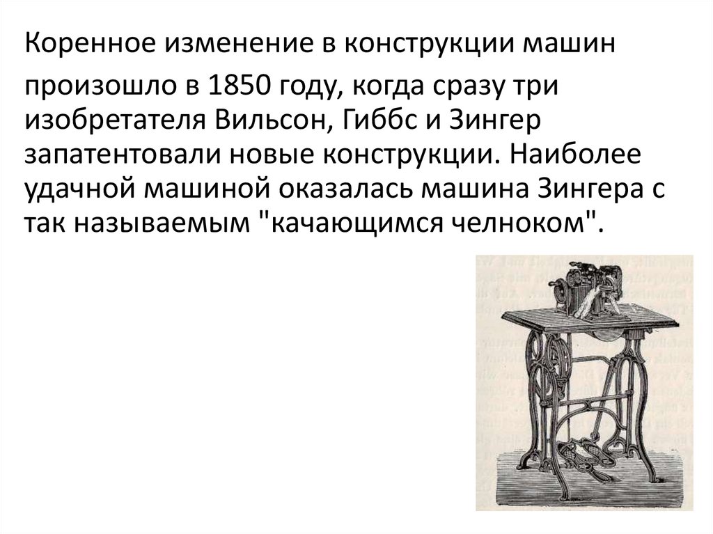 Коренное изменение в конструкции машинпроизошло в 1850 году, когда сразу три