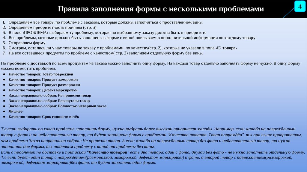 товар с фото и на недоставленный товар, то будет заполнена форма с проблемой “Качество товаров: Товар повреждён”, т.к она выше приоритетом,