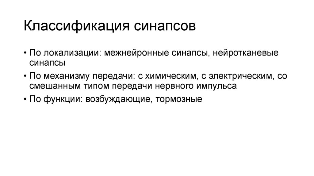 Классификация синапсов• По локализации: межнейронные синапсы, нейротканевые