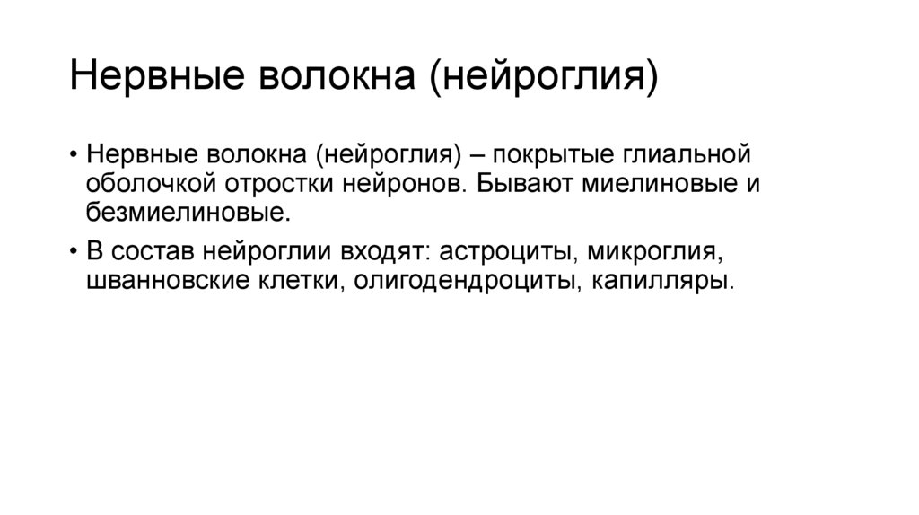 Нервные волокна (нейроглия)• Нервные волокна (нейроглия) – покрытые глиальной