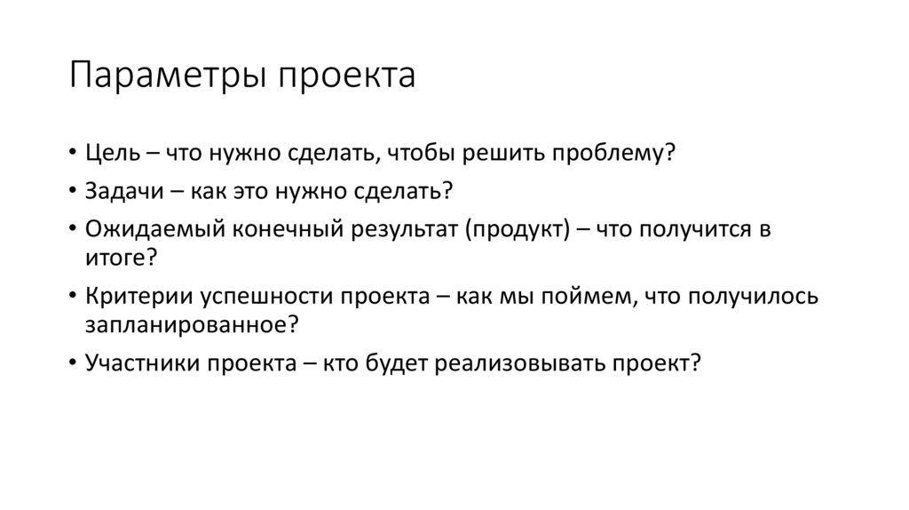 Параметры проекта• Цель – что нужно сделать, чтобы решить проблему?