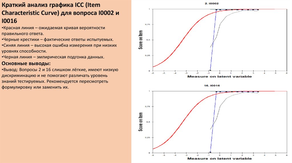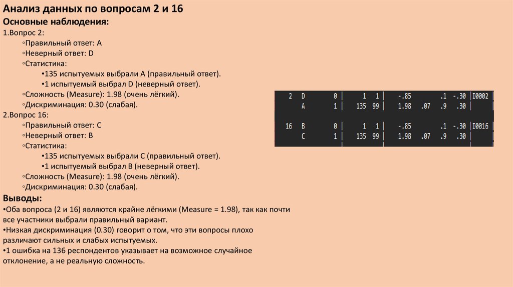 •Оба вопроса (2 и 16) являются крайне лёгкими (Measure = 1.98), так как почти