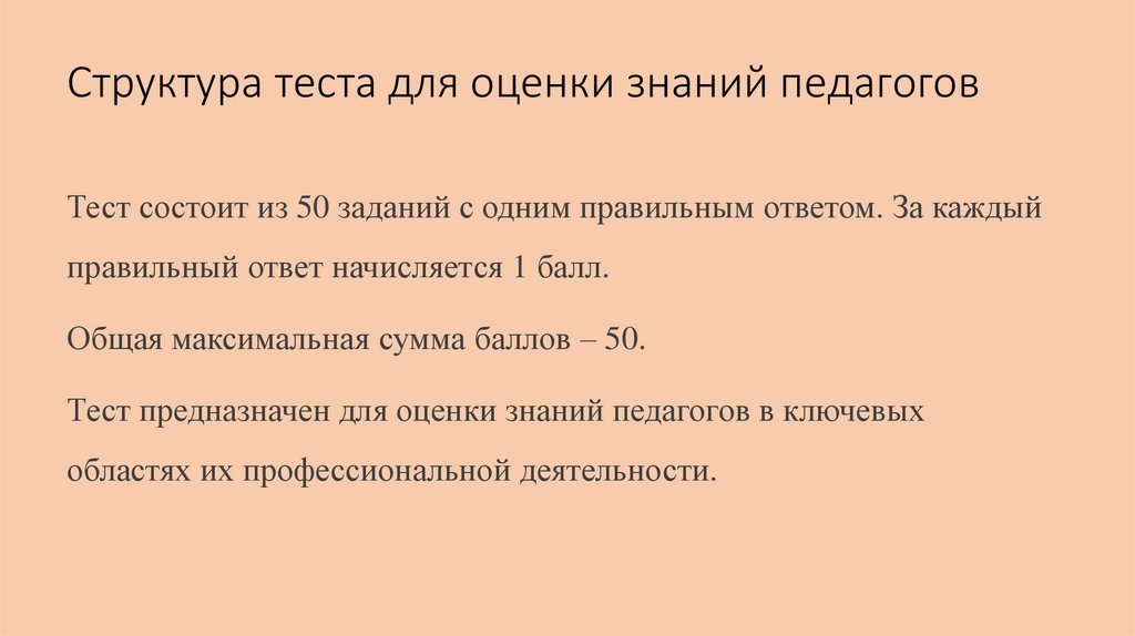 Структура теста для оценки знаний педагоговТест состоит из 50 заданий с одним правильным ответом. За каждый