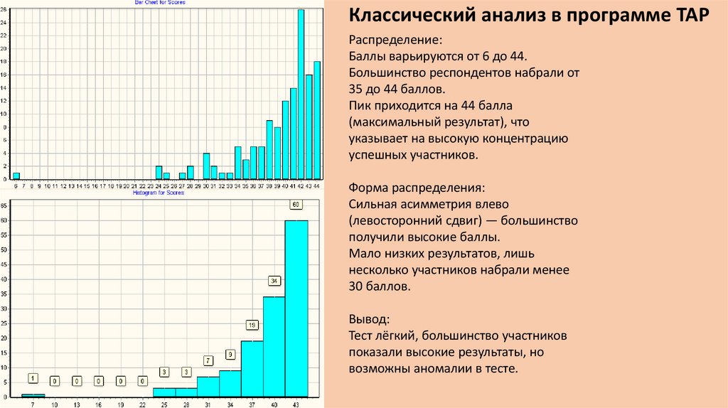 •Максимальный балл: 44 (88%), Минимальный: 21 (42%).