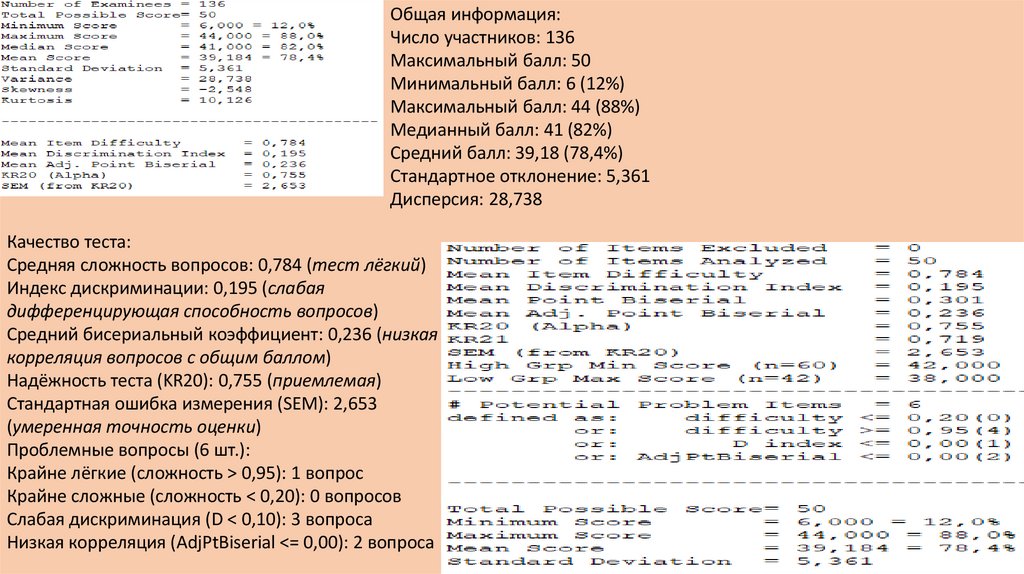 ◦Дискриминация: 0.30 (слабая).