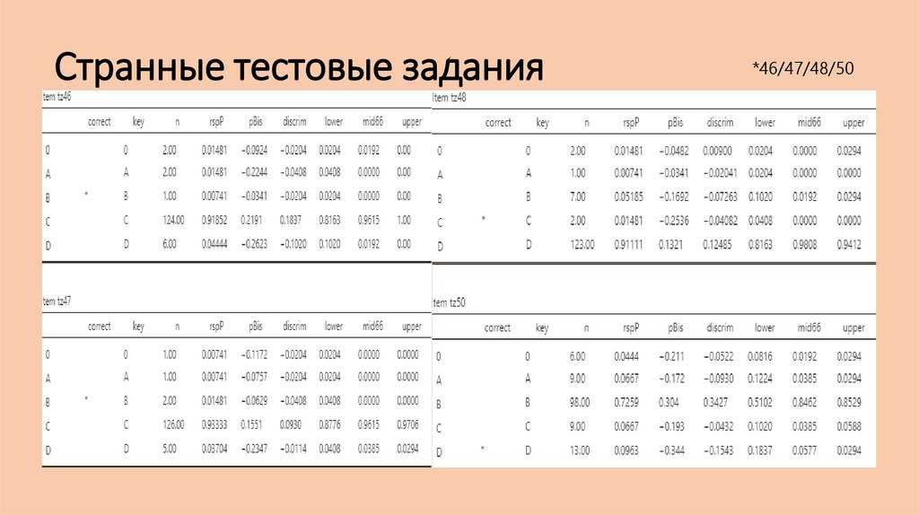 •Низкая дискриминация (0.30) говорит о том, что эти вопросы плохо