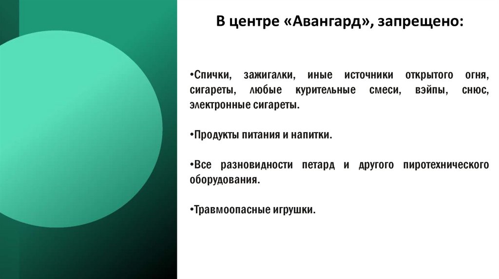 В центре «Авангард», запрещено:•Спички, зажигалки, иные источники открытого огня,