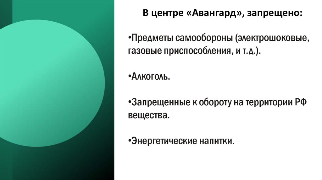 В центре «Авангард», запрещено:•Предметы самообороны (электрошоковые,
