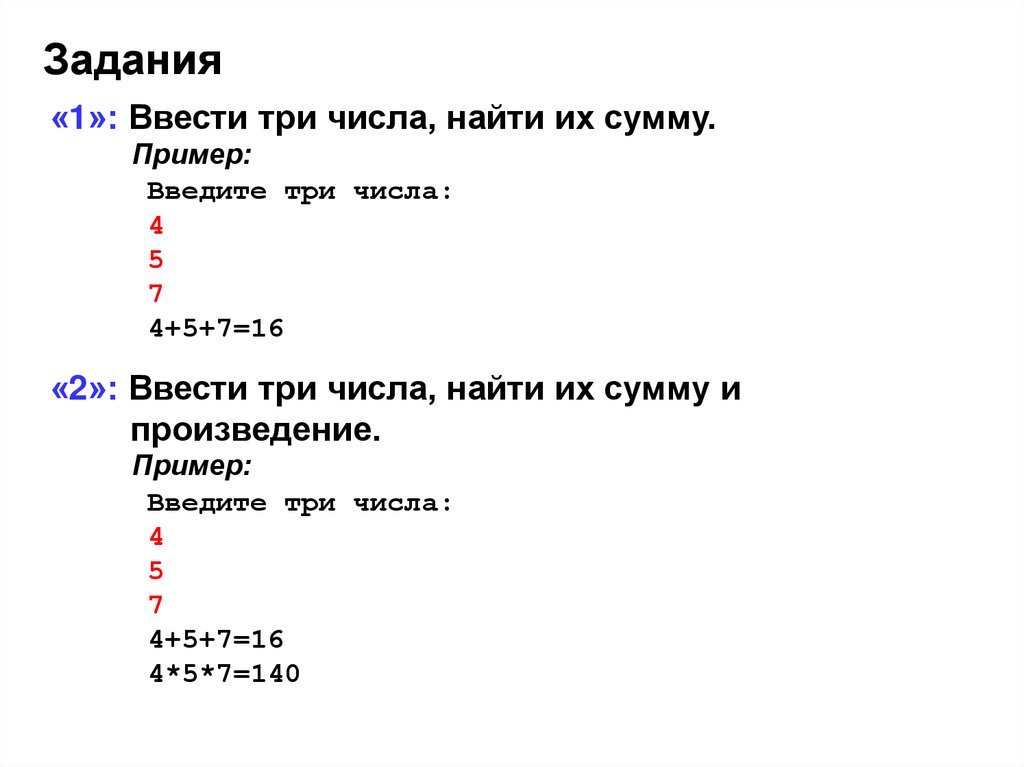 Задача. Ввести с клавиатуры два числа и найти их сумму.Протокол: