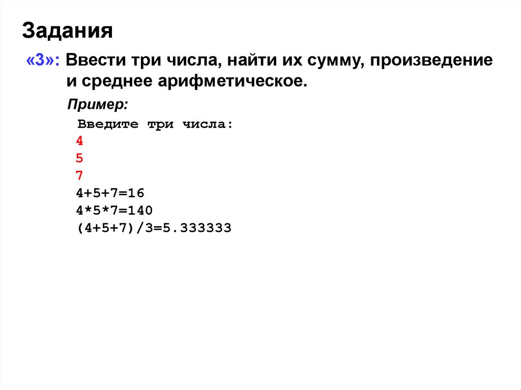 «3»: Ввести три числа, найти их сумму, произведениеи среднее арифметическое.