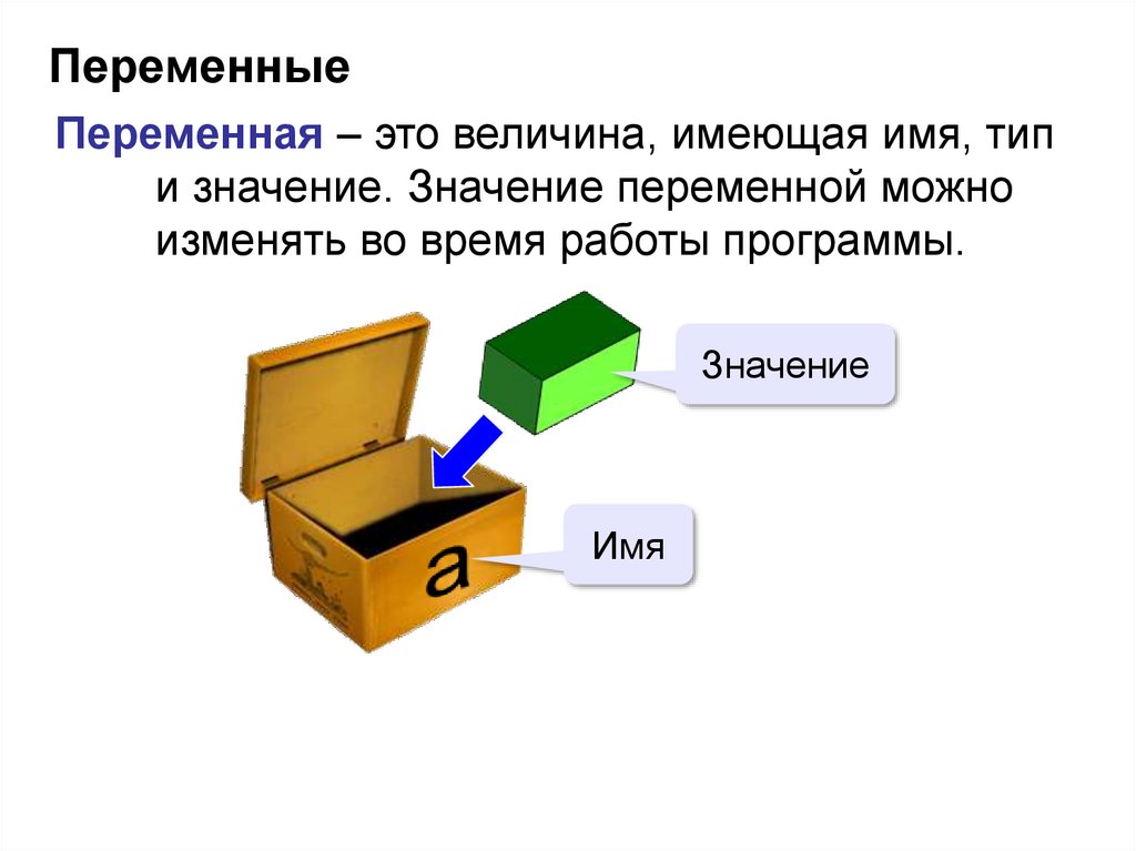Переменная – это величина, имеющая имя, типи значение. Значение переменной можно