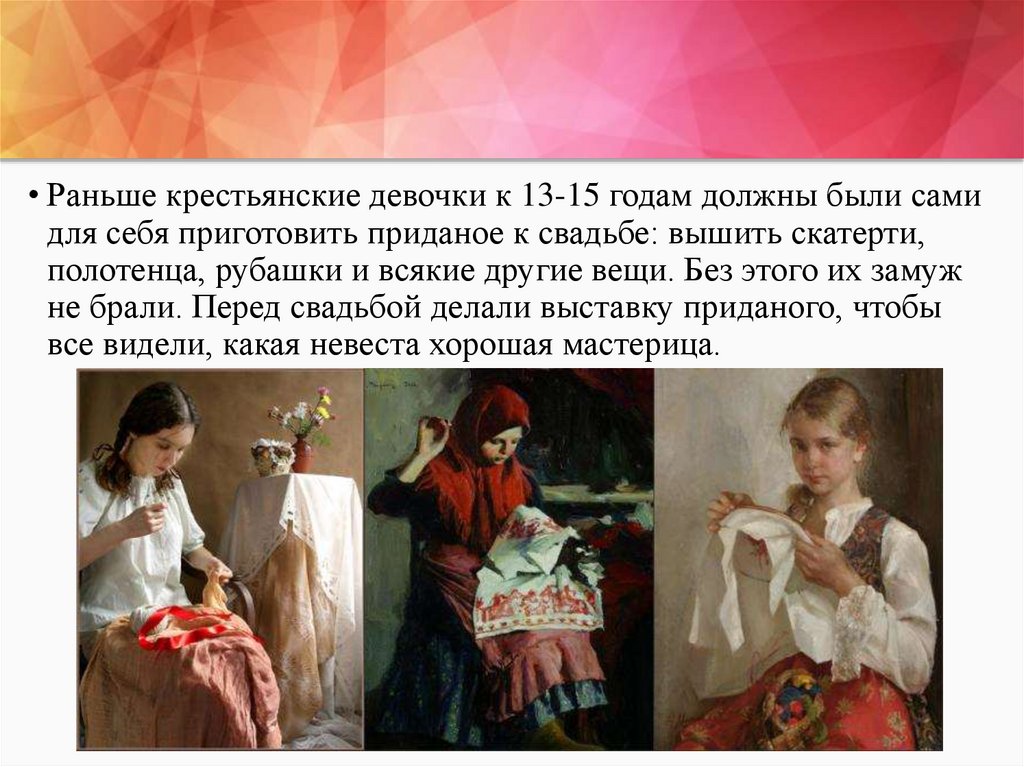 • Раньше крестьянские девочки к 13-15 годам должны были самидля себя приготовить приданое к свадьбе: вышить скатерти,