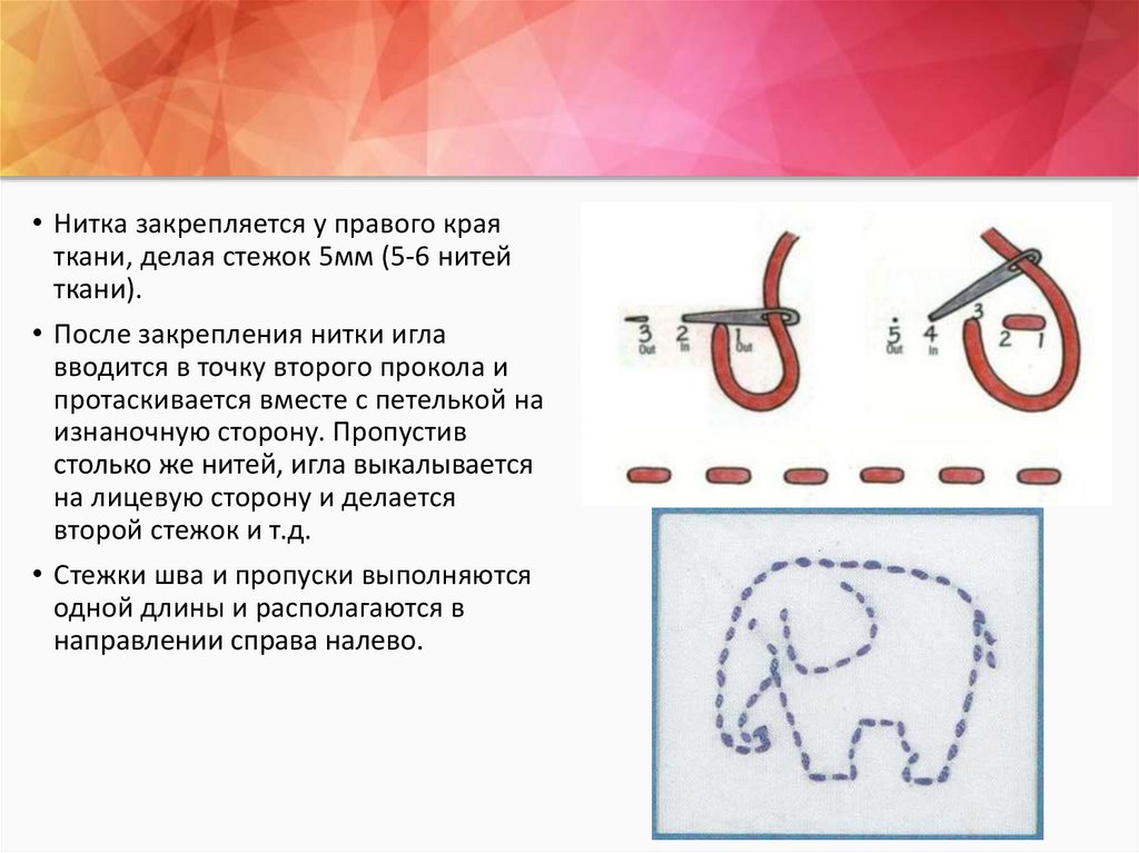 • Шов “Вперед иголку” чаще всегоиспользуется не для вышивки, а