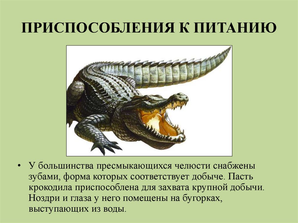 • У большинства пресмыкающихся челюсти снабженызубами, форма которых соответствует добыче. Пасть
