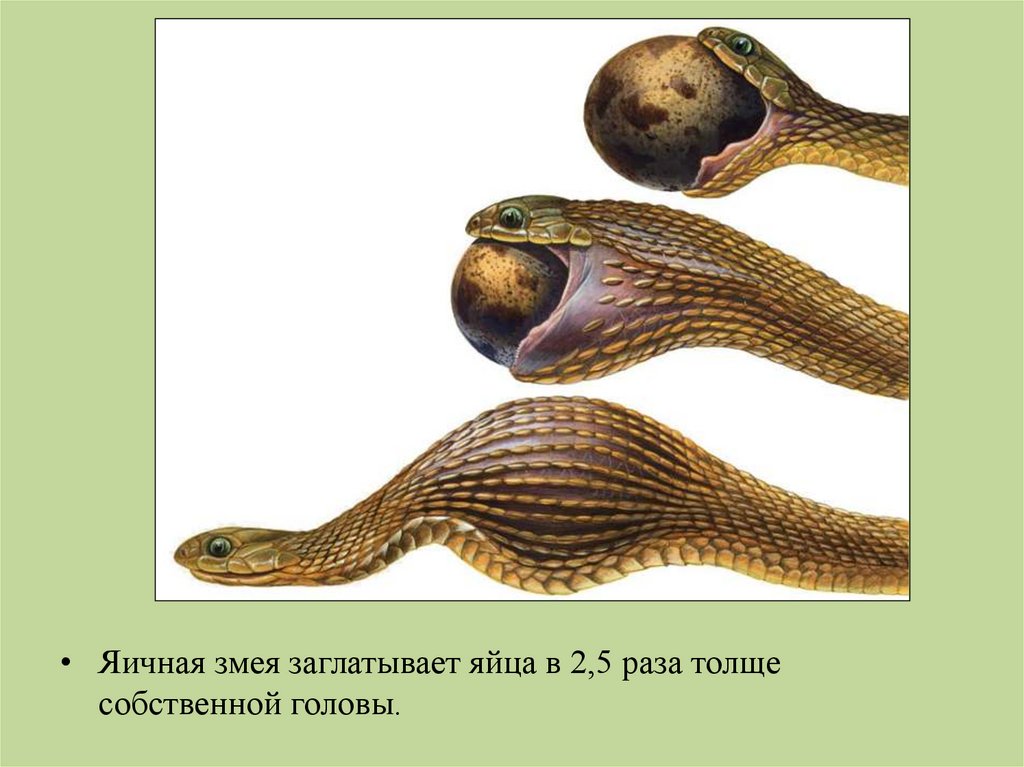 • Яичная змея заглатывает яйца в 2,5 раза толщесобственной головы.