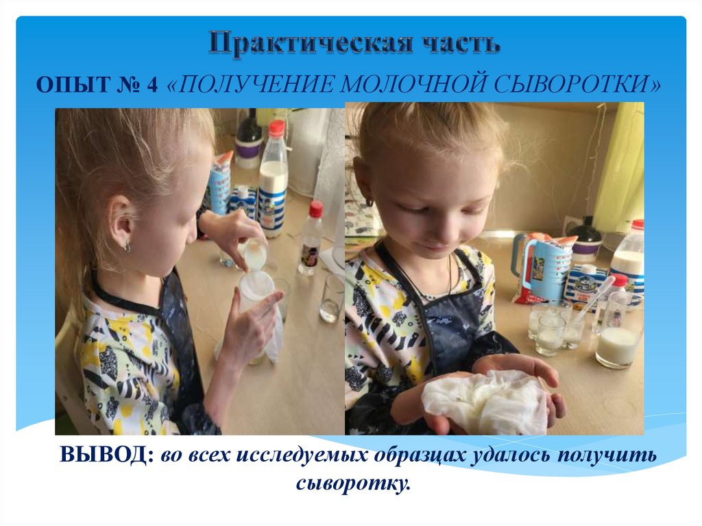 ОПЫТ № 4 «ПОЛУЧЕНИЕ МОЛОЧНОЙ СЫВОРОТКИ»ВЫВОД: во всех исследуемых образцах удалось получить