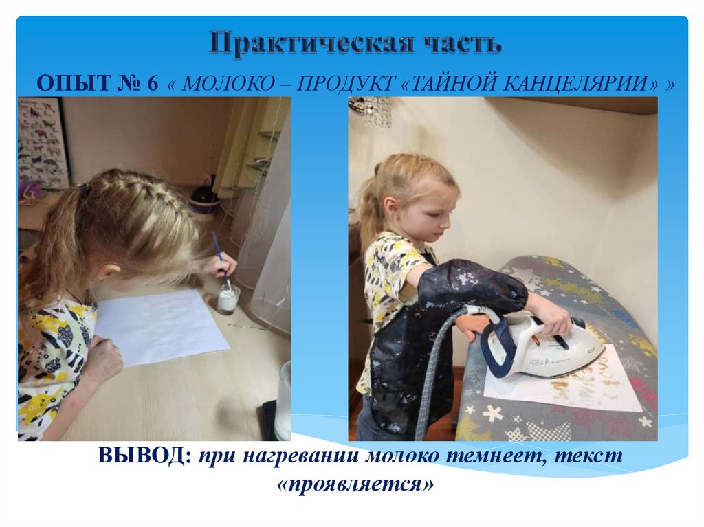 ОПЫТ № 6 « МОЛОКО – ПРОДУКТ «ТАЙНОЙ КАНЦЕЛЯРИИ» »ВЫВОД: при нагревании молоко темнеет, текст