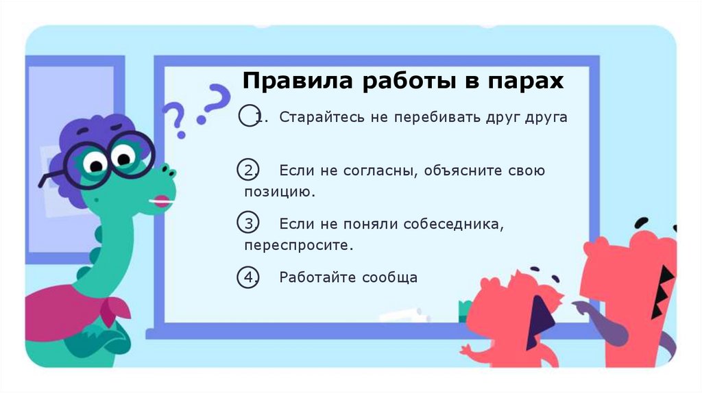 Правила работы в парах1. Старайтесь не перебивать друг друга