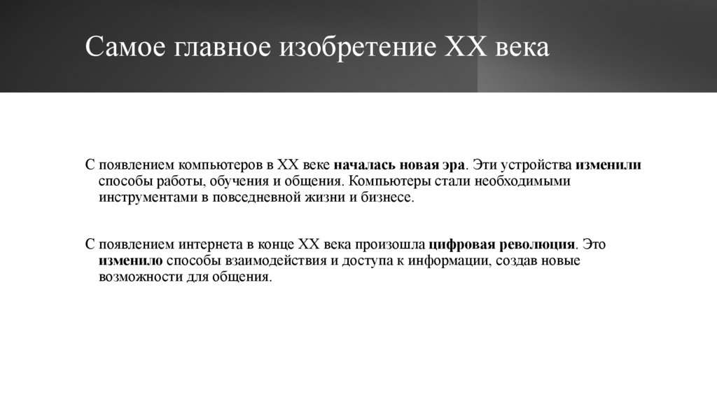 Самое главное изобретение XX векаС появлением компьютеров в XX веке началась новая эра. Эти устройства изменили