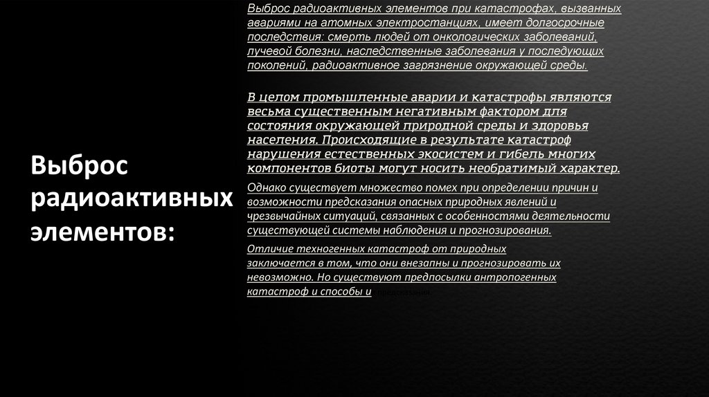 Выброс радиоактивных элементов при катастрофах, вызванныхавариями на атомных электростанциях, имеет долгосрочные