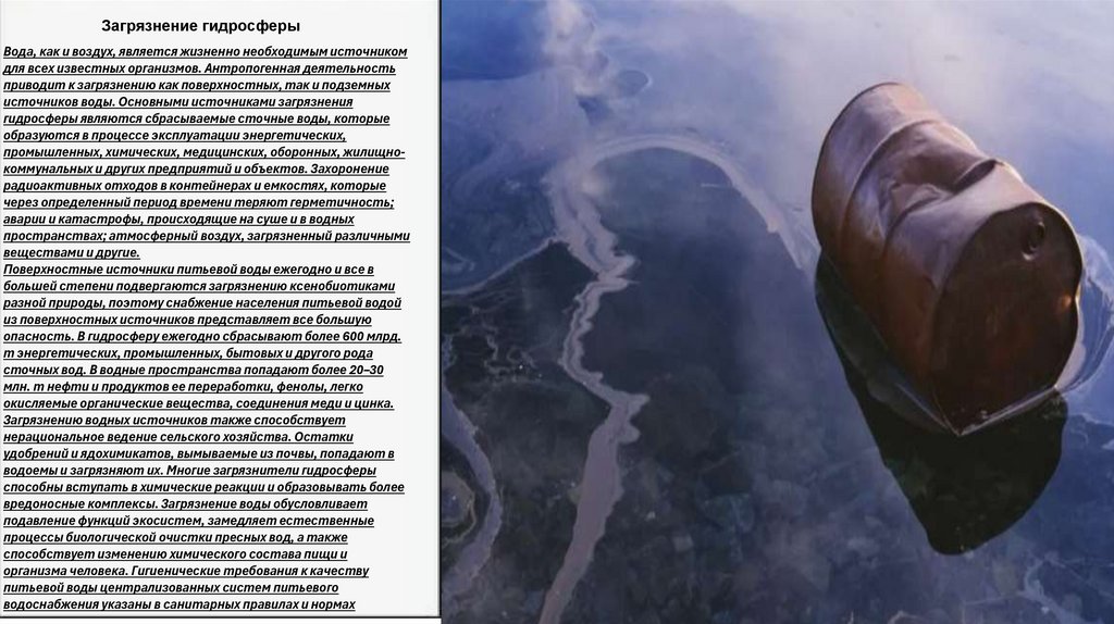 ущерба от антропогенного воздействия: ⦁ В воде увеличивается содержание вредных примесей как