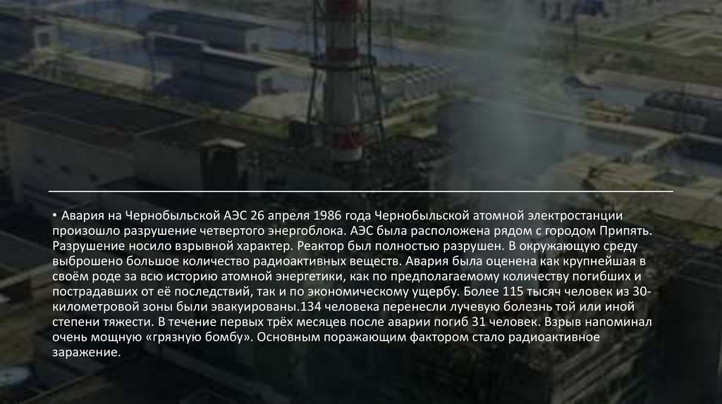 • Авария на Чернобыльской АЭС 26 апреля 1986 года Чернобыльской атомной электростанциипроизошло разрушение четвертого энергоблока. АЭС была расположена рядом с городом Припять.