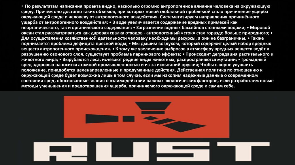 • По результатам написания проекта видно, насколько огромно антропогенное влияние человека на окружающуюсреду. Причём оно достигло таких объёмов, при которых новой глобальной проблемой стало причинение ущерба