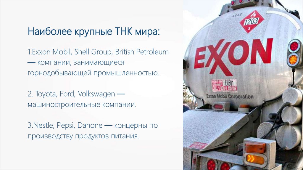Наиболее крупные ТНК мира:1.Exxon Mobil, Shell Group, British Petroleum