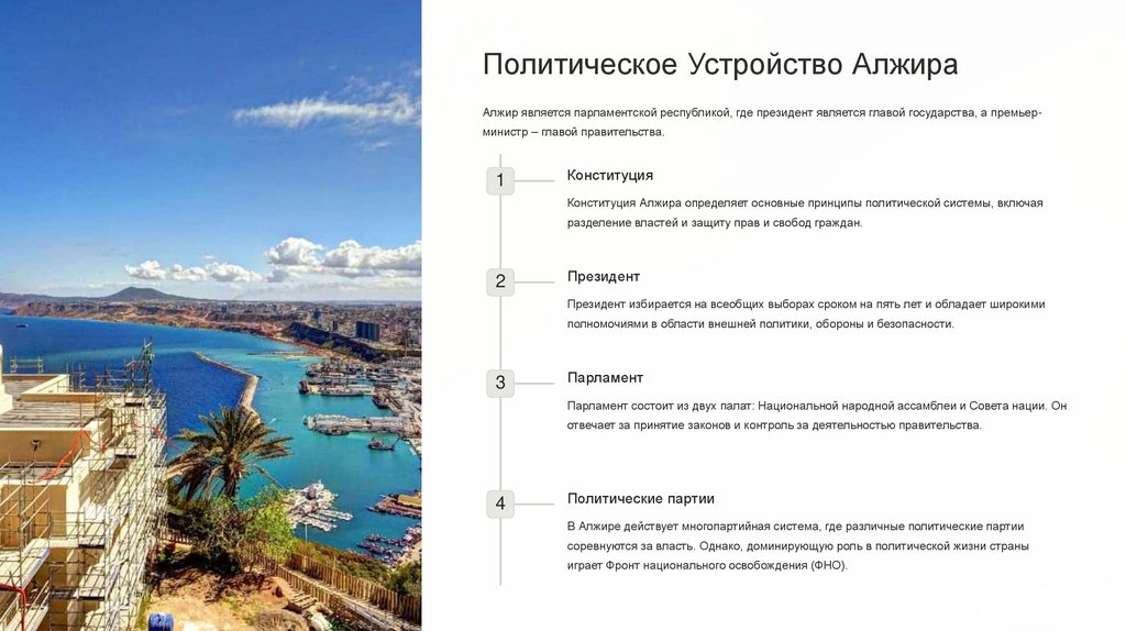 Политическое Устройство АлжираАлжир является парламентской республикой, где президент является главой государства, а премьерминистр – главой правительства.