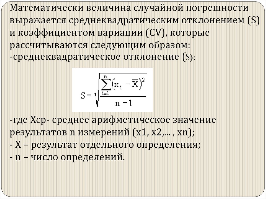 Математически величина случайной погрешностивыражается среднеквадратическим отклонением (S)