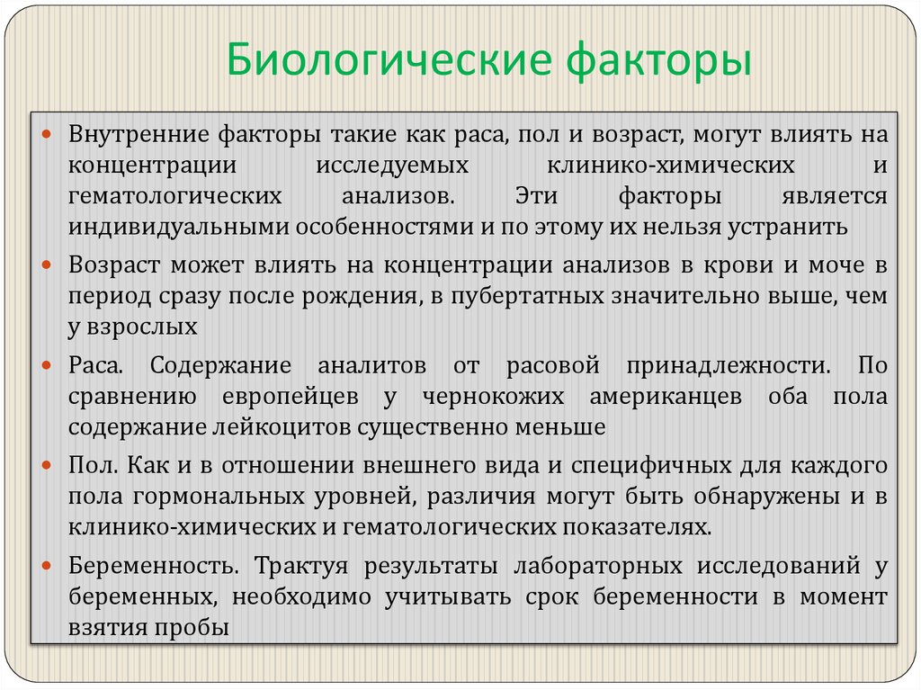 Биологические факторыВнутренние факторы такие как раса, пол и возраст, могут влиять на
