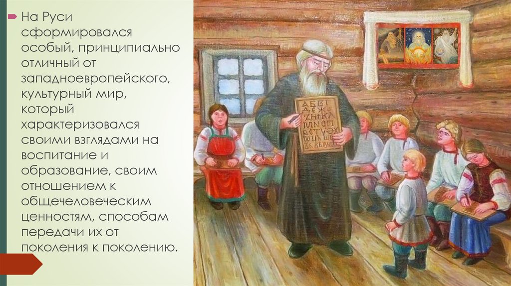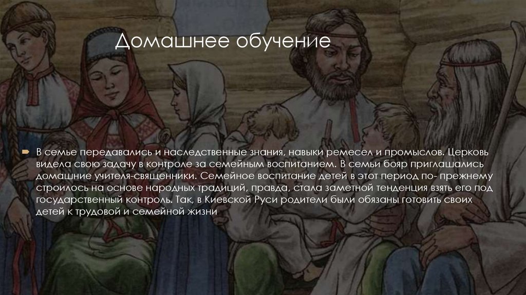 Домашнее обучениеВ семье передавались и наследственные знания, навыки ремесел и промыслов. Церковь