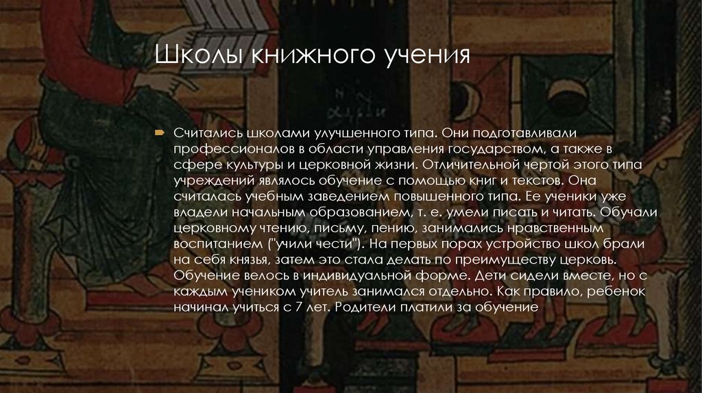 Школы книжного ученияСчитались школами улучшенного типа. Они подготавливали