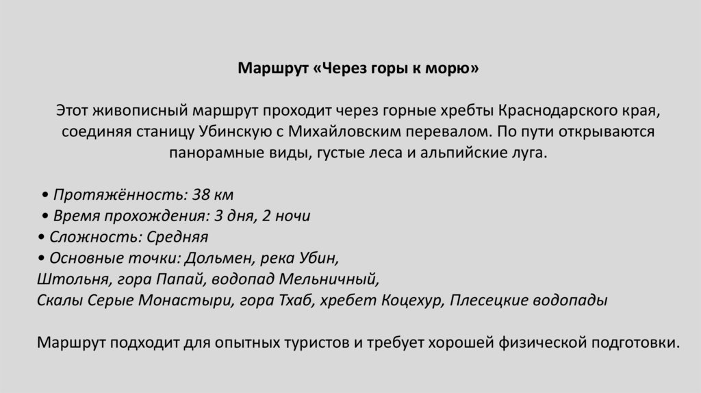 Маршрут «Через горы к морю»Этот живописный маршрут проходит через горные хребты Краснодарского края,