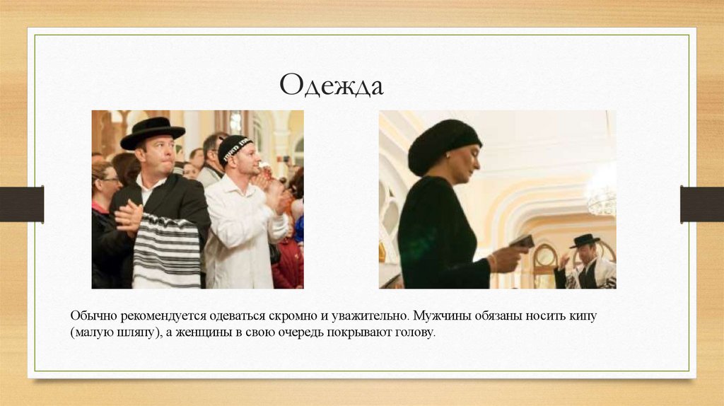 ОдеждаОбычно рекомендуется одеваться скромно и уважительно. Мужчины обязаны носить кипу