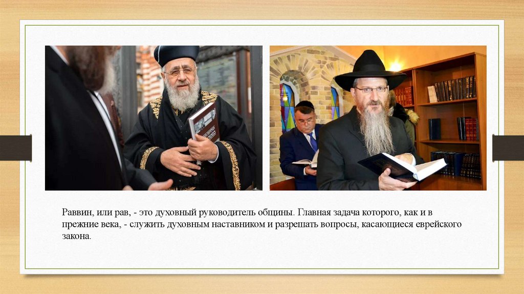 Раввин, или рав, - это духовный руководитель общины. Главная задача которого, как и впрежние века, - служить духовным наставником и разрешать вопросы, касающиеся еврейского
